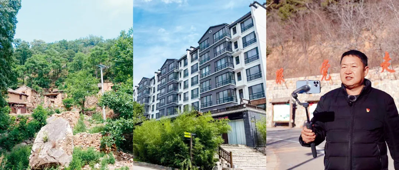陈春芳通过直播向网友展示车谷砣村新面貌。(左图为村民老屋、中图为新建楼房)受访者供图