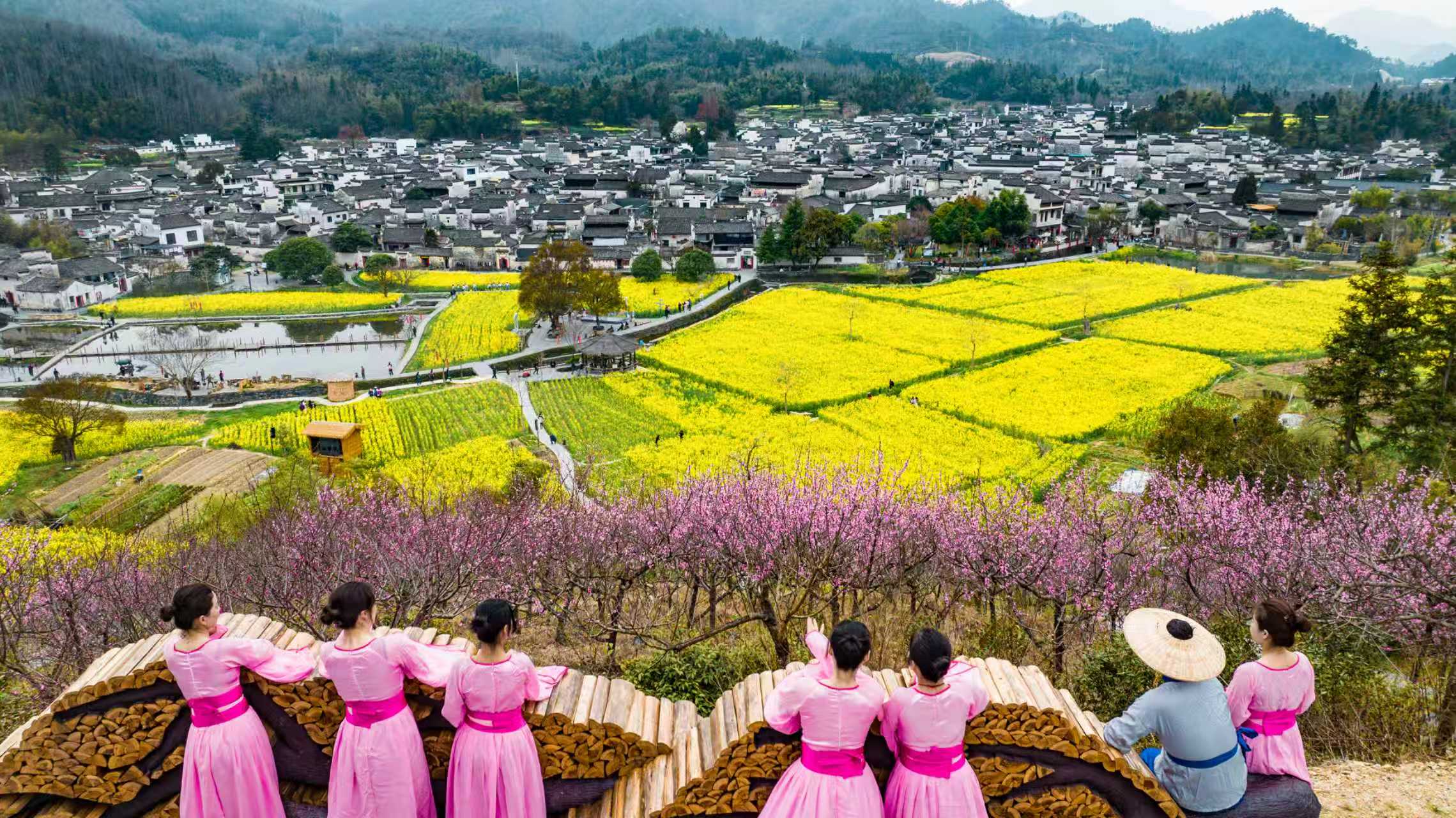 在安徽省黄山市黟县西递镇西递村,金黄花海与白墙黛瓦的徽派古民居相映成趣,游客登高远眺,感受“人在画中游”的诗意与美好。