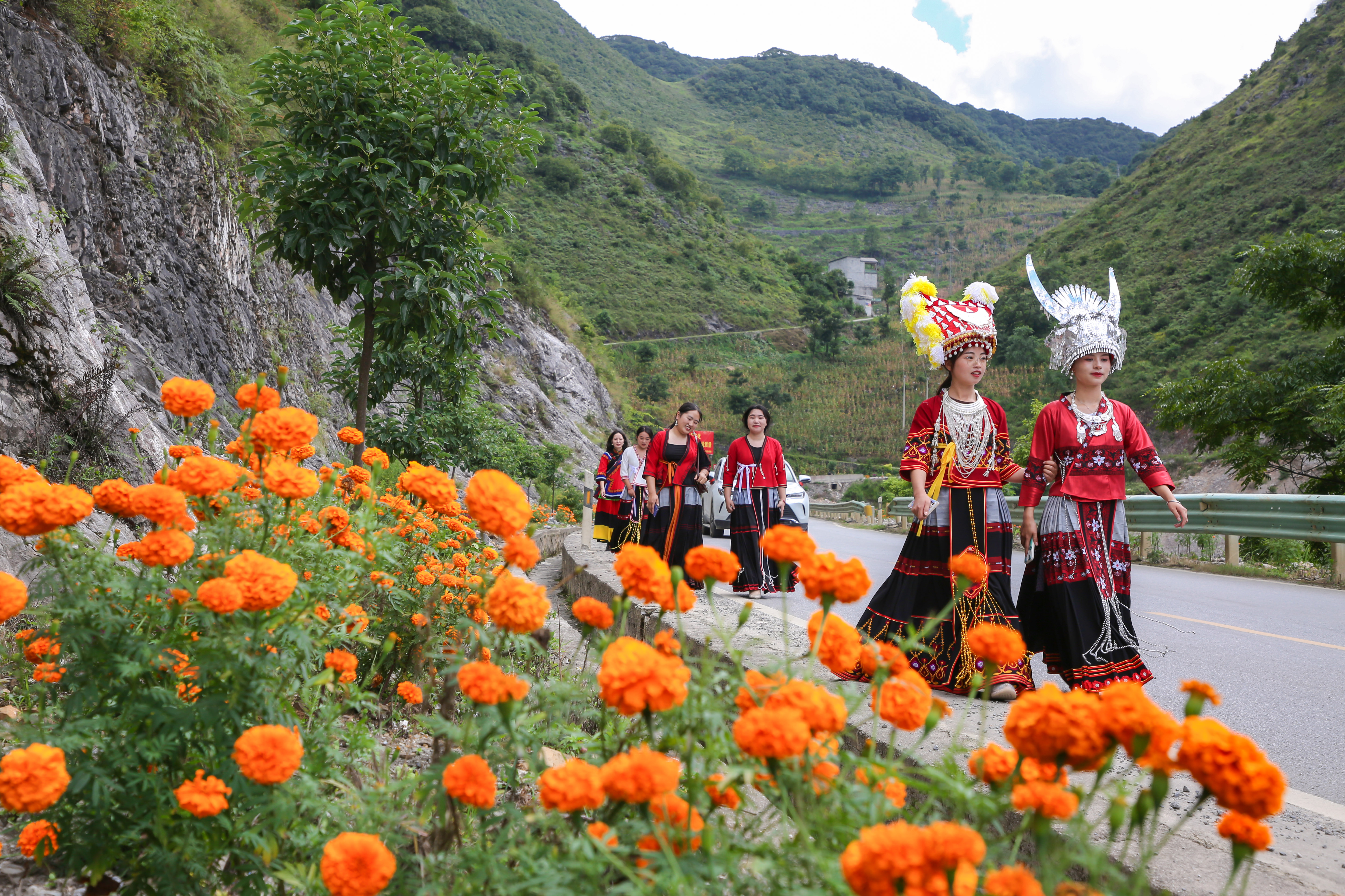 在广西百色市隆林各族自治县德峨镇德峨村,盛装打扮的苗族姑娘们结伴出游赏花。