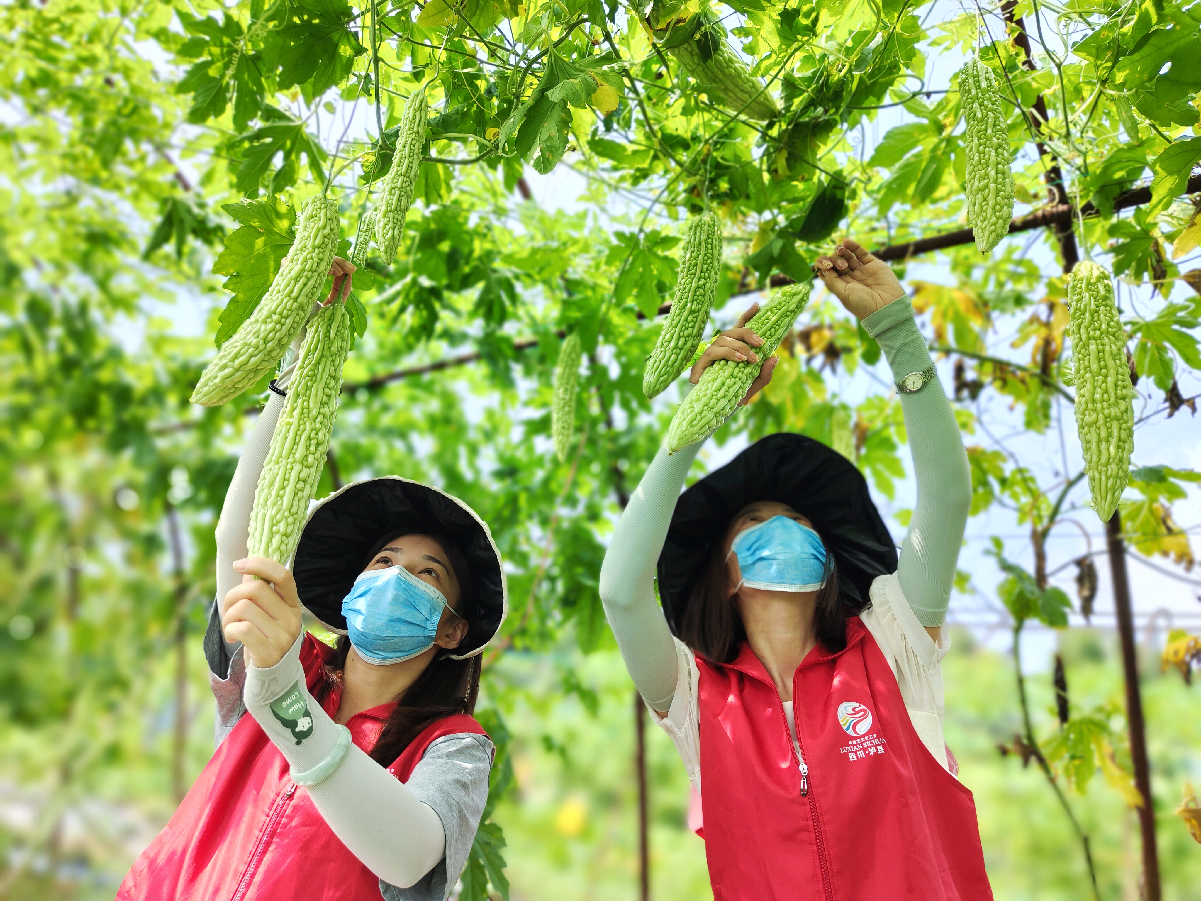 志愿者帮助农户采摘苦瓜。
