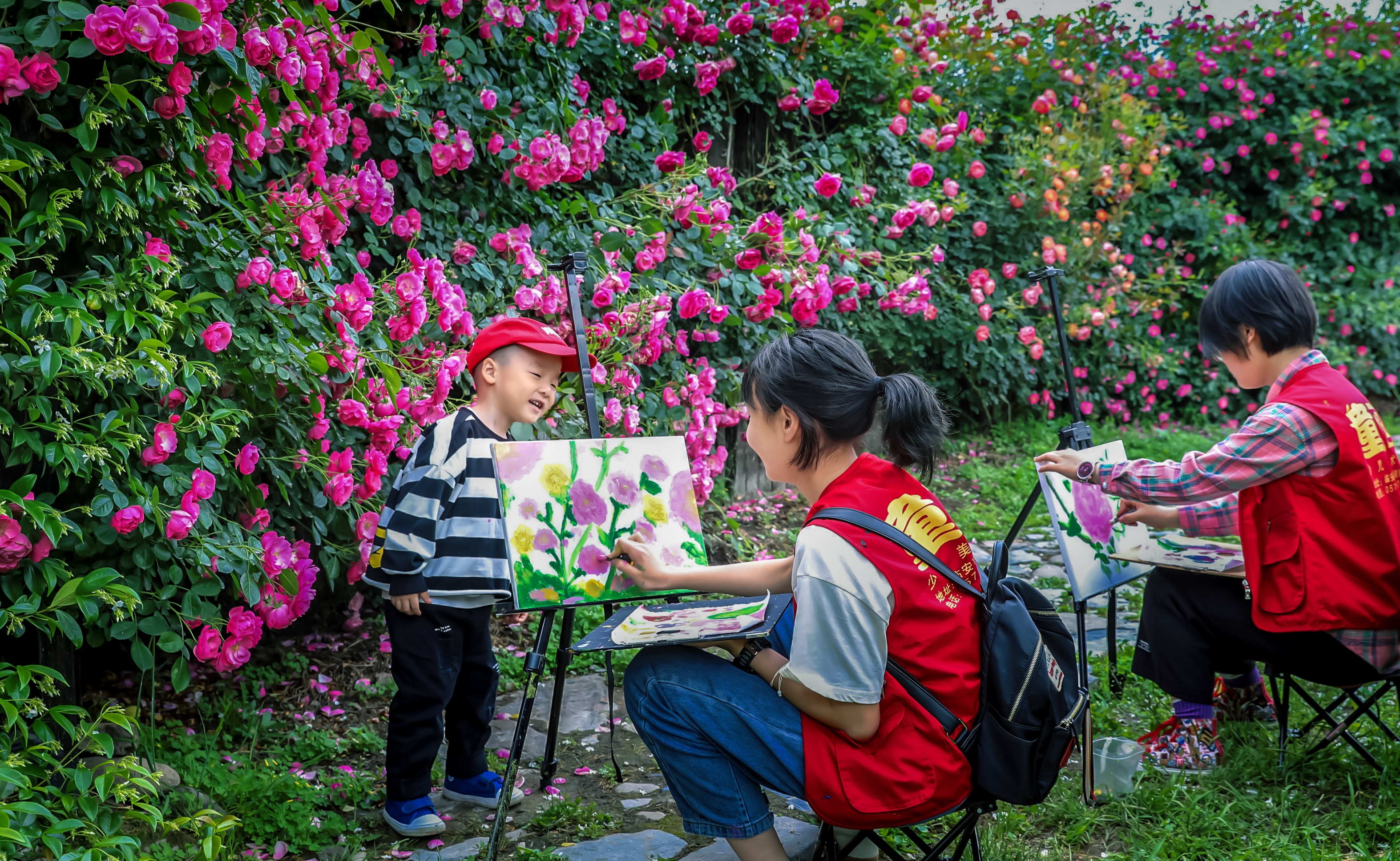 学生在草木花香玫瑰园写生。