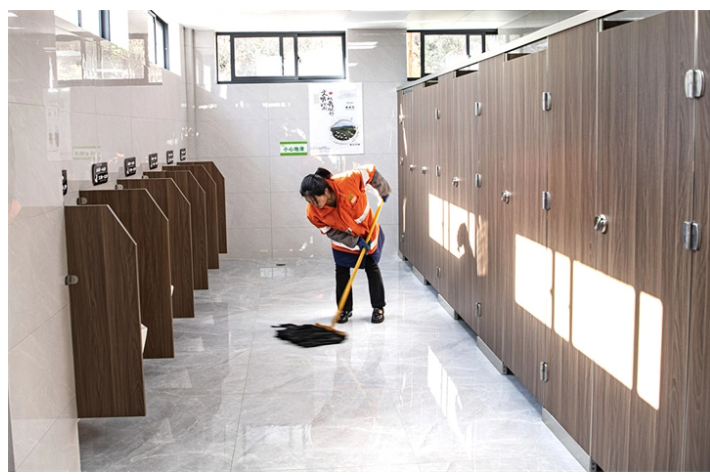 清洁工正在打扫公厕。